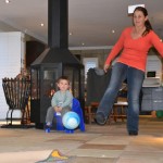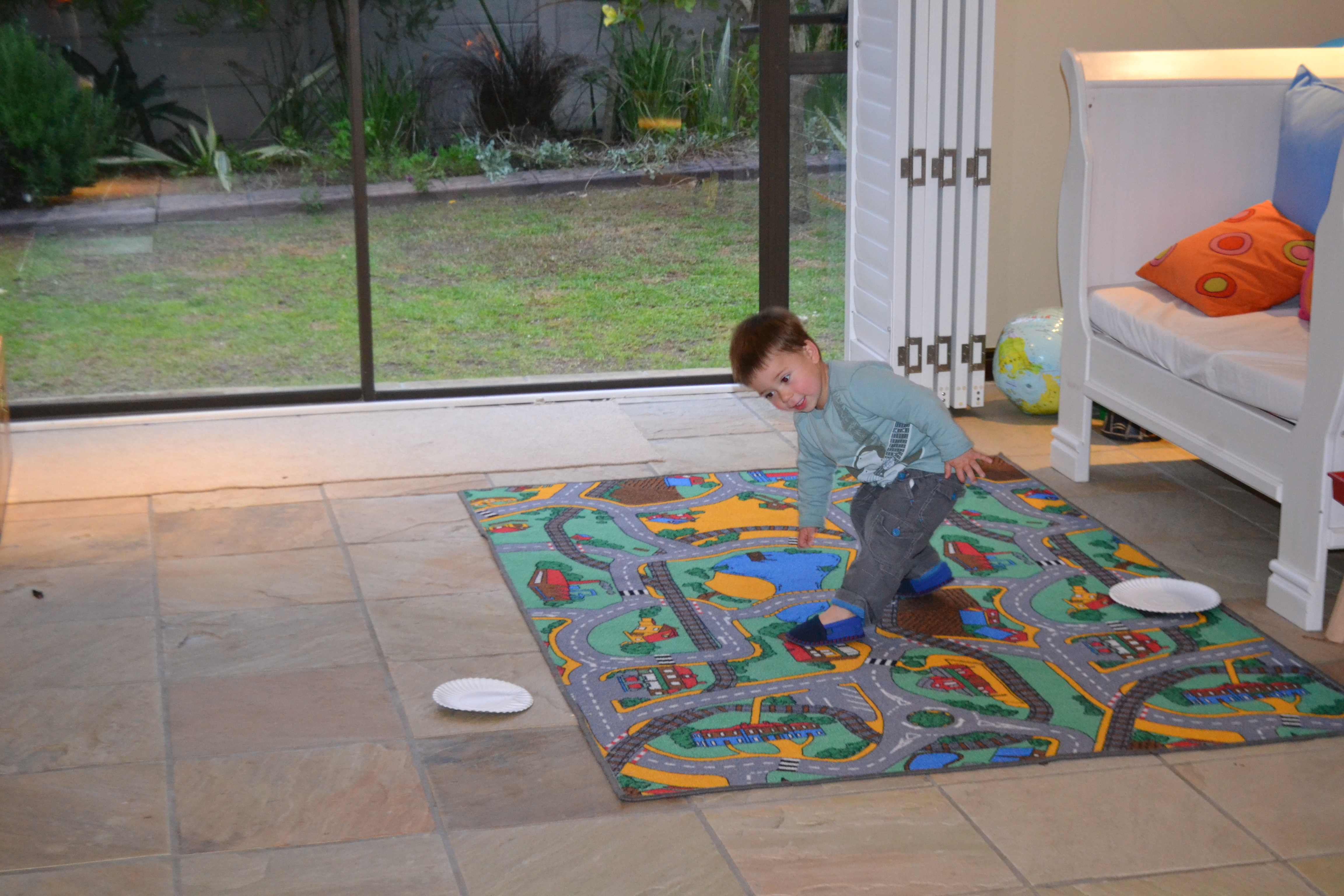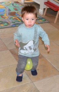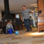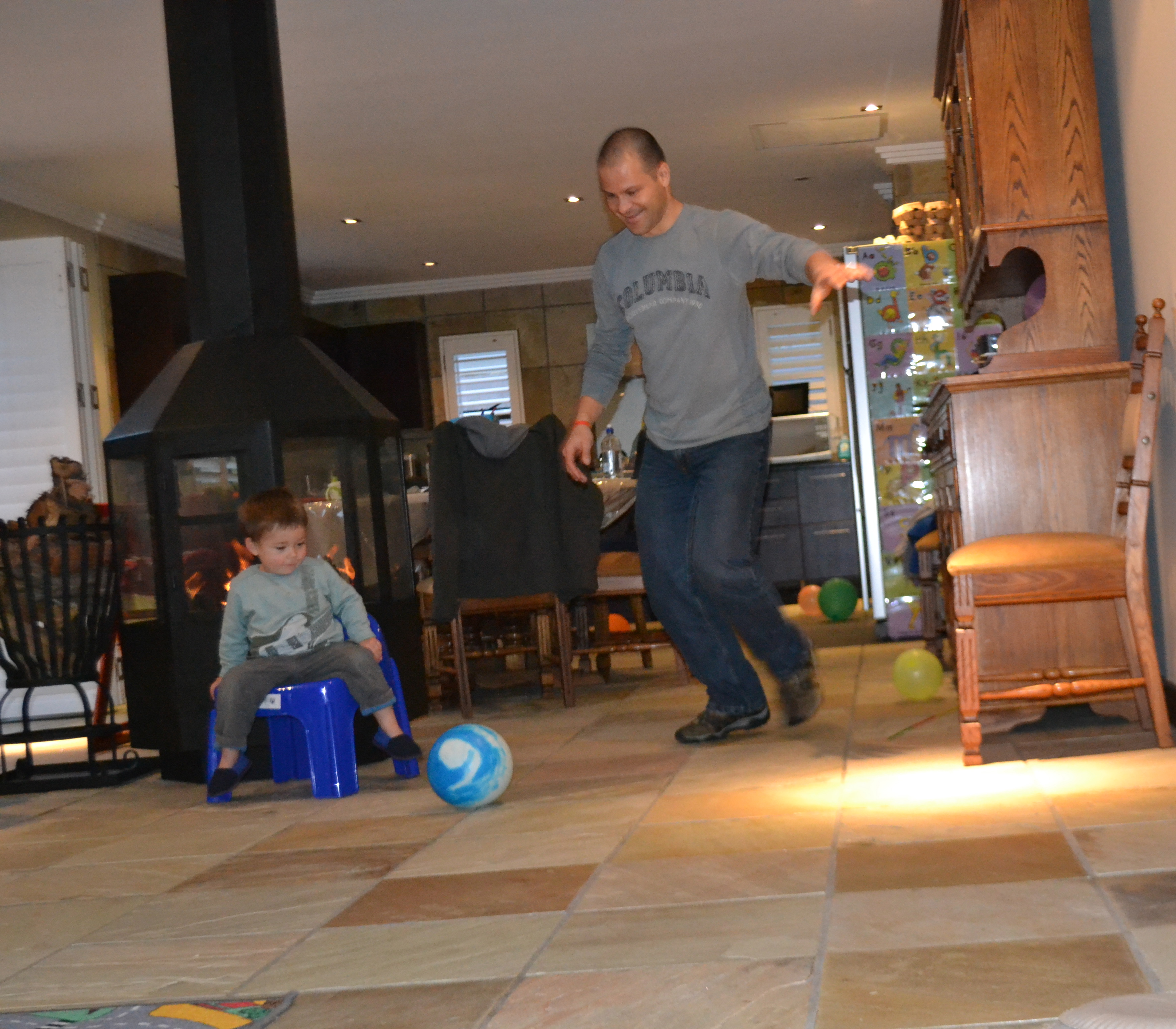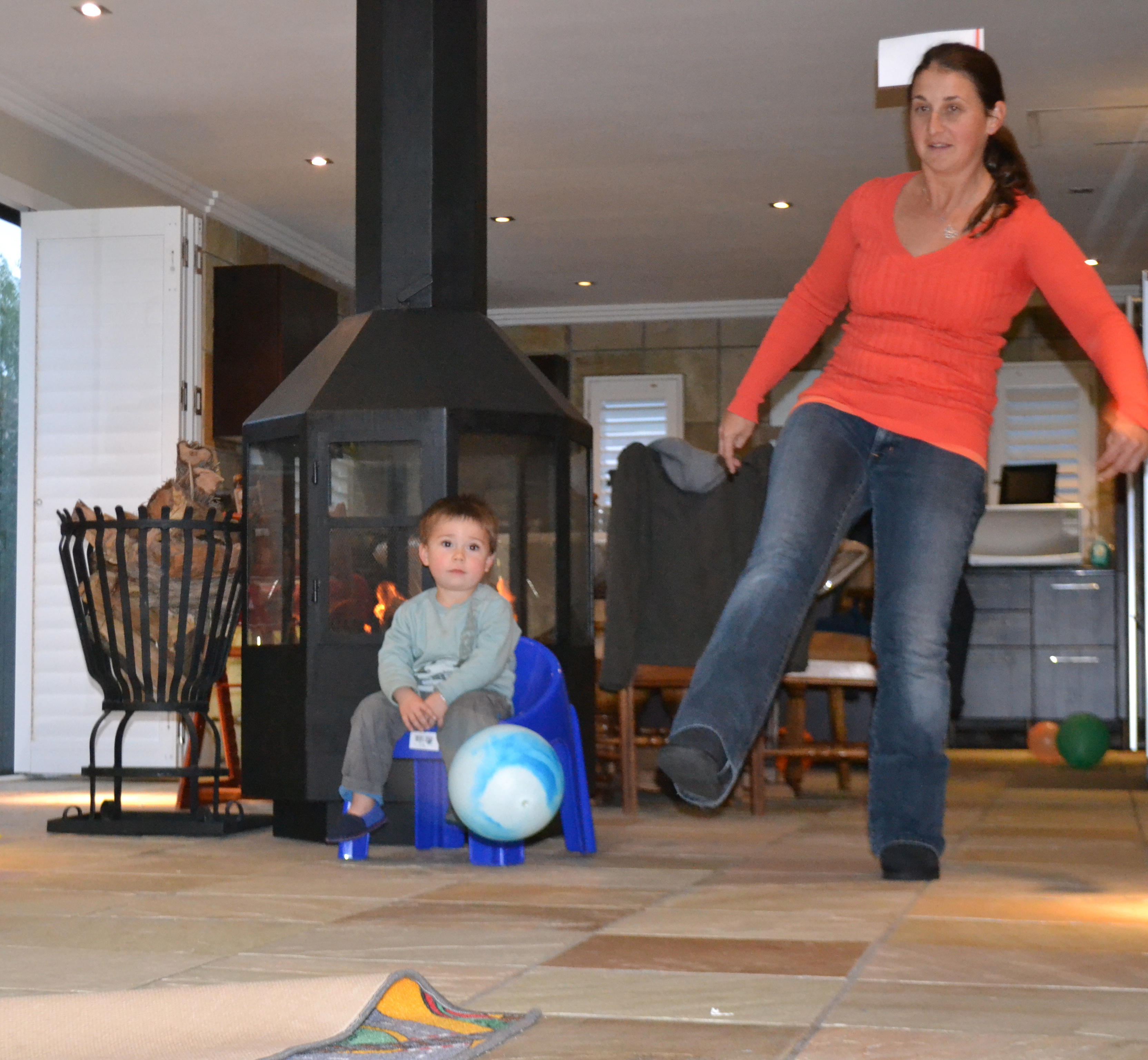 Here Lee-Ann is finally getting a turn. We had to make Camryn sit on the chair and wait his turn as he kept hijacking the ball. Please note his not-s0-impressed face.
