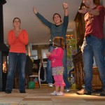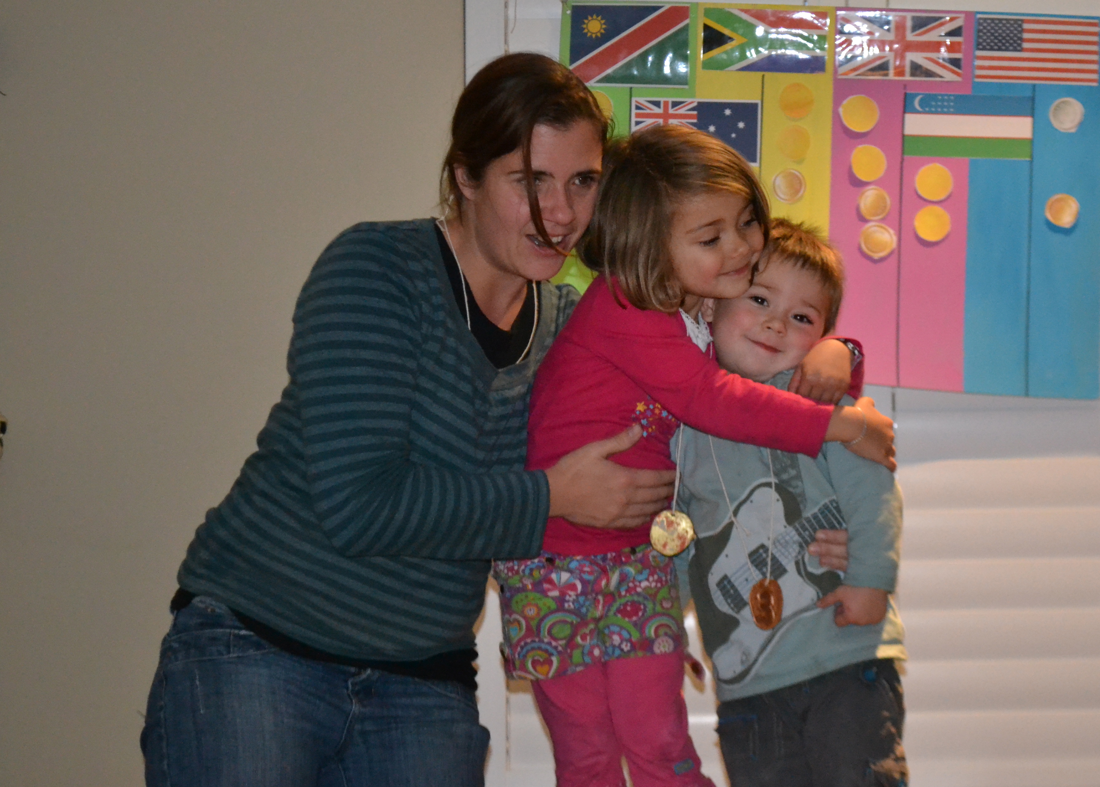 Eryn giving her brother a well done hug, and mom trying to keep both children from falling off the podium.